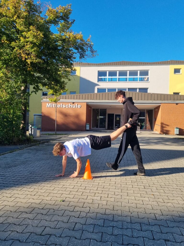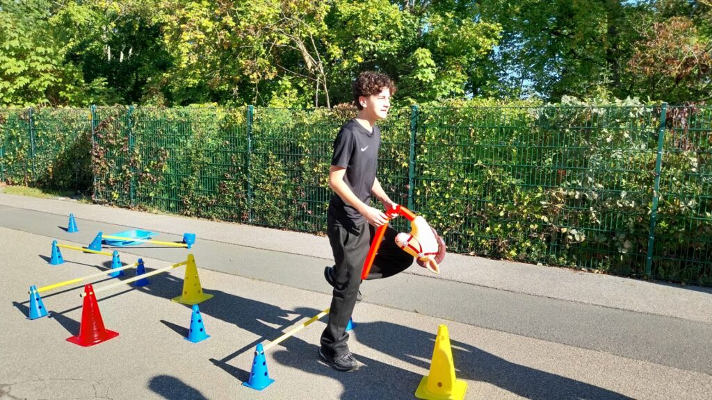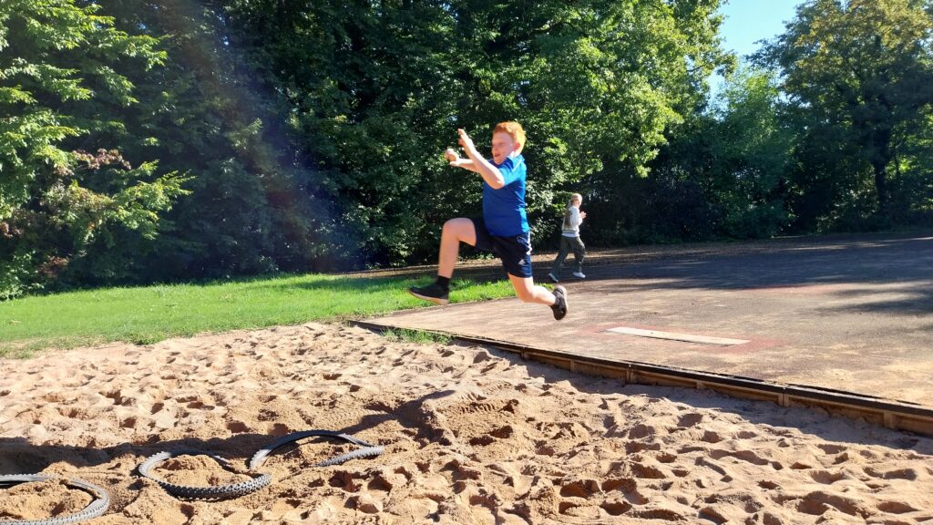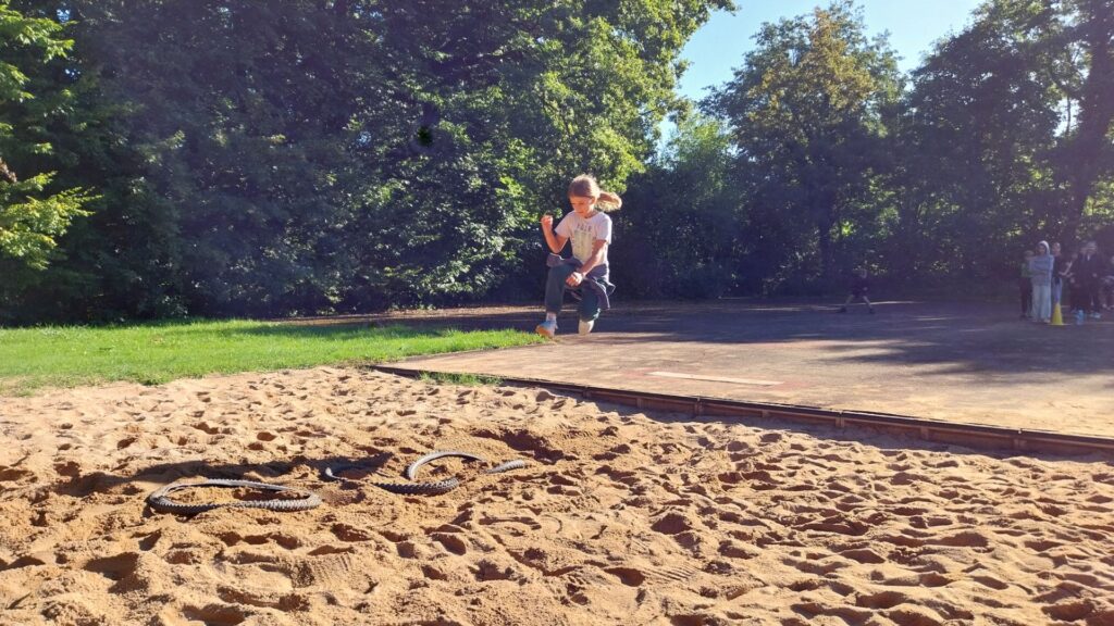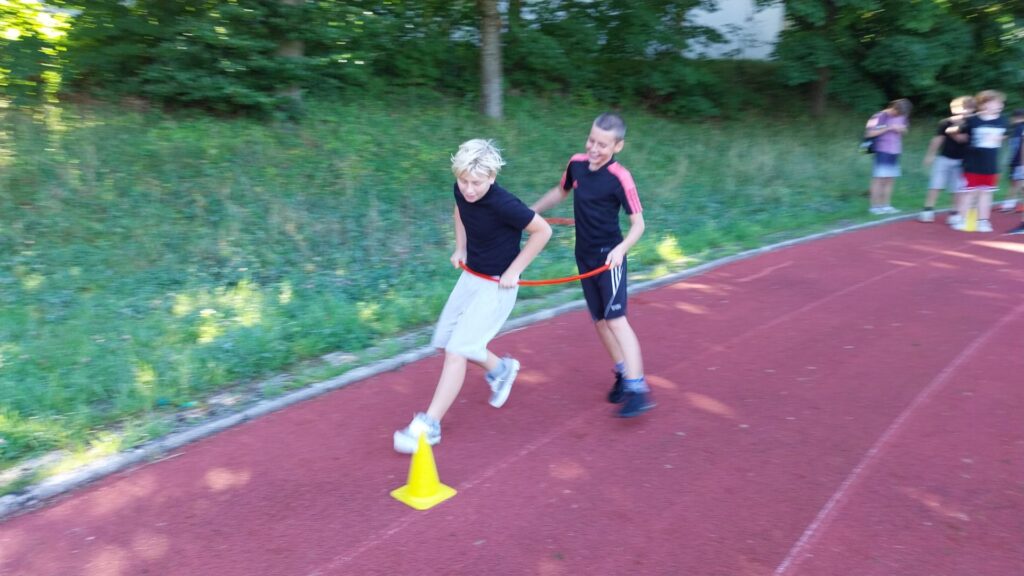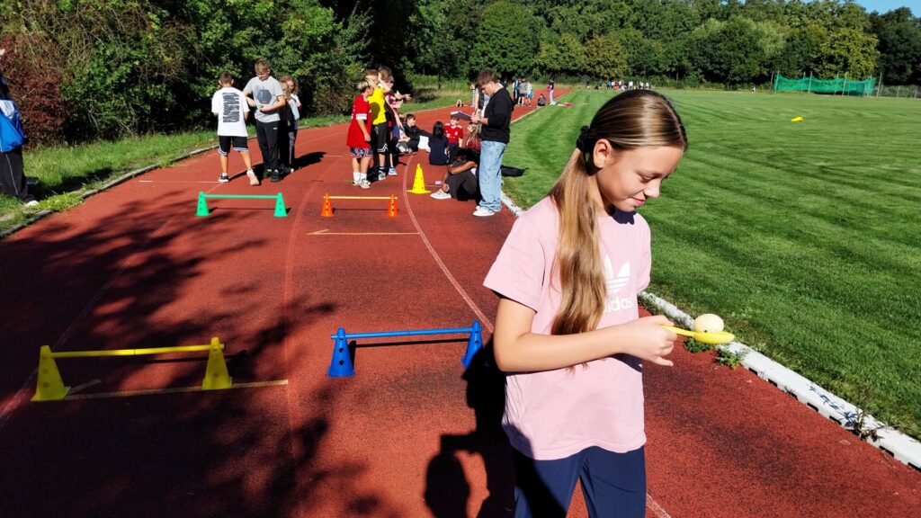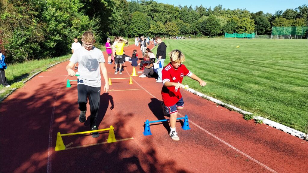 Das Sportfest war ein gelungener Abschluss der ersten Schulwoche – und war natürlich viel besser als normaler Unterricht! Die Schülerinnen und Schüler zeigten sich an insgesamt 16 Stationen von ihrer sportlichen Seite. Sie konnten sich nicht nur mit anderen Klassen messen, sondern auch innerhalb ihrer eigenen Klasse gegeneinander antreten. Dabei war allerlei geboten: Vom Papierfliegerweitwurf über Sackhüpfen, Ballsportarten bis hin zum Eierlauf und viele andere Disziplinen– für alle war etwas dabei!